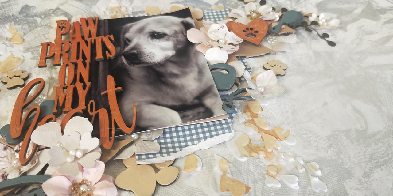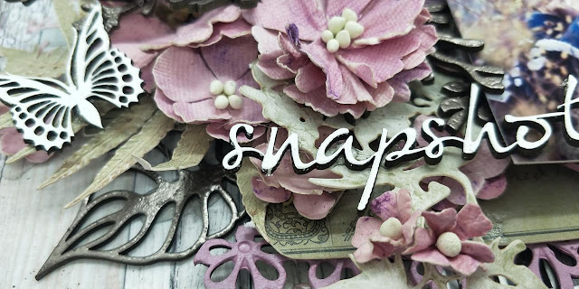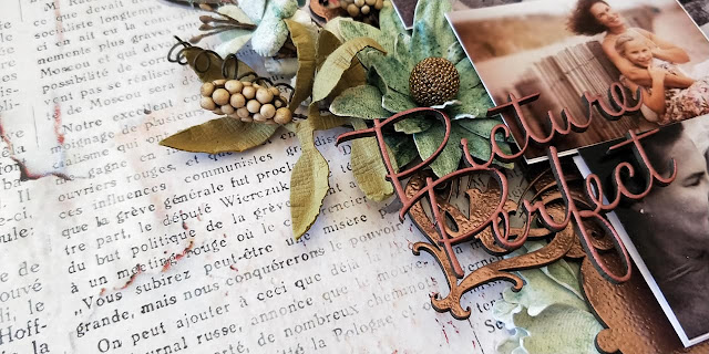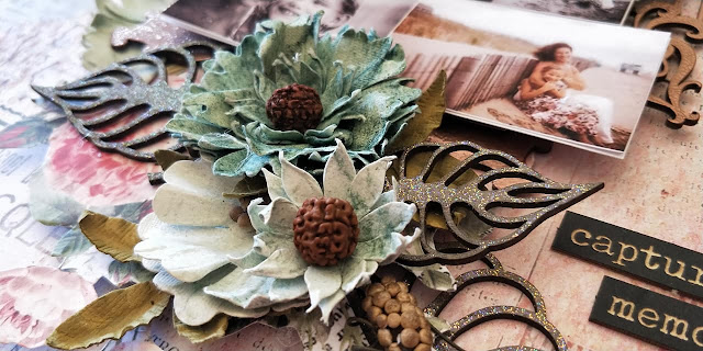 I didn't give this layout a title, not sure why but in the end I just didn't think it needed one so just left it be. I covered my chosen pieces of Dusty Attic Chipboard in two different colours of distress embossing powder. Next I randomly stamped some teal ink with a diamond stamp on my 49 and Market background paper. I then layered my chipboard pieces along with my photo onto the background. Underneath my photo I added some cheese cloth and coconut fibre to add some texture. The flowers I made using several different flower dies and some Kaisercraft silk foam and layered them on top of all my chipboard pieces.